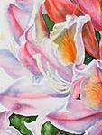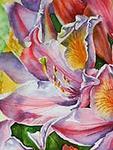 Masking fluid was applied to the stamen clusters and to the bright white edges of some flower petals. This preserves the detail areas with no need to try to paint around them.