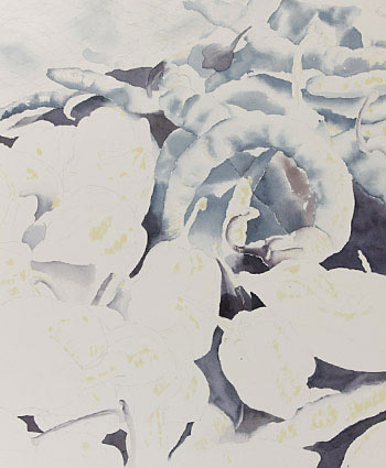 Filling in the red-checked tablecloth immediately tells us that the peppers are lying in a jumble on a flat surface. The shadows cast on the cloth by the peppers in the upper left now make sense in the painting.