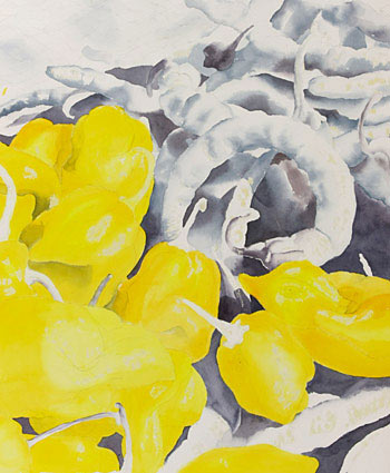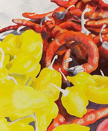 2. The shadow mix was used sparingly under the yellow paint for the habaneros. The shapes of these peppers were developed with a cool lemony yellow and a warm yellow that suggests more shadowing.