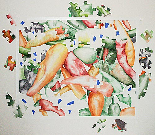 1. The drawing of the peppers and puzzle pieces is faint in the photo, but absolutely necessary to keep track of the complexity of the composition. Small bits of blue tape mark the blank areas where puzzle pieces are missing, hopefully to keep me from painting there!