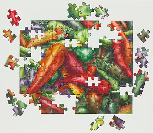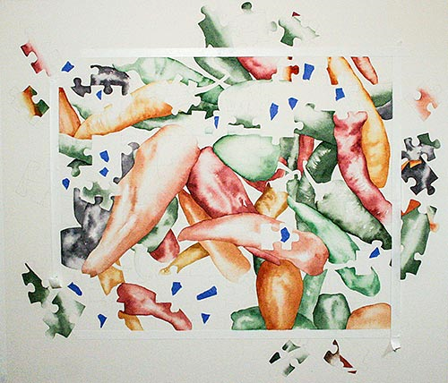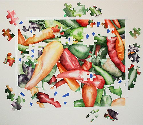 Another painting depicting a jigsaw puzzle with a jumble of brightly colored peppers - and missing pieces. Each piece lying around the edge of the painting belongs in a blank space. Looking carefully at the real painting, there are, literally, Lost Edges.
