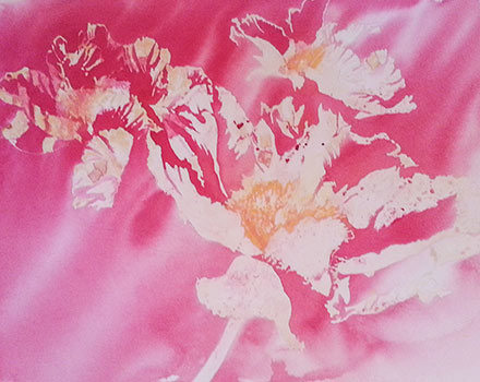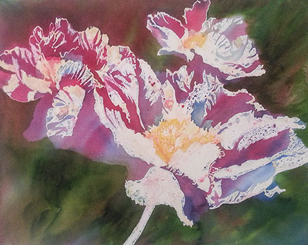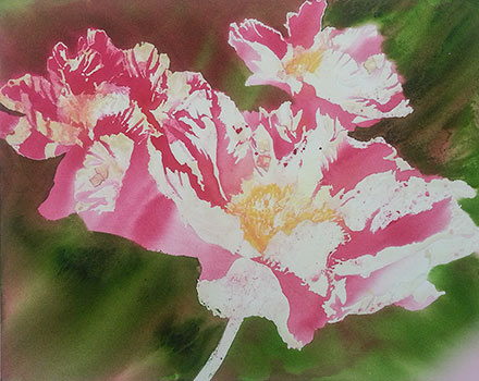 1. This painting was created using a lot of masking fluid and a process of pouring paint on wet paper. Masking fluid was applied to the petals in bright light. This will reserve the white paper when the paint is poured.