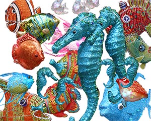 The fish and seahorses that are on the forward plane in front of other fish, are painted around first. I try to use paints in the same color family as the background splashes. This helps keep the colors more intense.